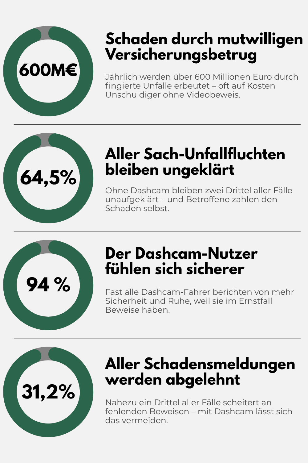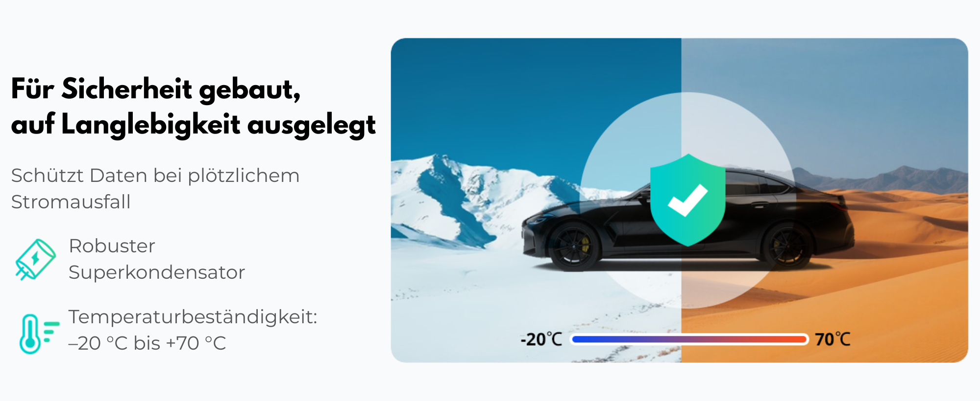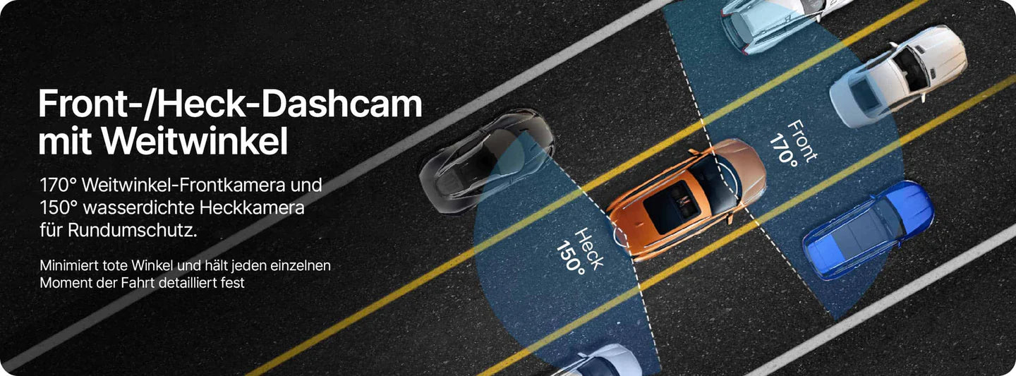 Das System erfasst die Fahrtroute aus zwei Perspektiven: Die Frontkamera dokumentiert den Fahrtweg mit breitem 170°-Weitwinkel und erfasst damit nicht nur die Straße vor dir, sondern auch Randbereiche und seitliche Bedrohungen. Die unauffällige Rückkamera sorgt für Sicherheit bei Auffahrunfällen und Parkplatz-Vorfällen.